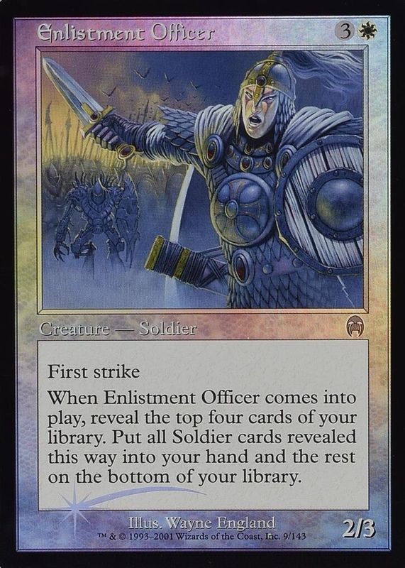 Enlistment Officer's Magic: The Gathering cards are available in at least 1 sets. Enlistment Officer's biggest 7-day price movers are 2001 Apocalypse #9 Foil, and 2001 Apocalypse #9 Base.