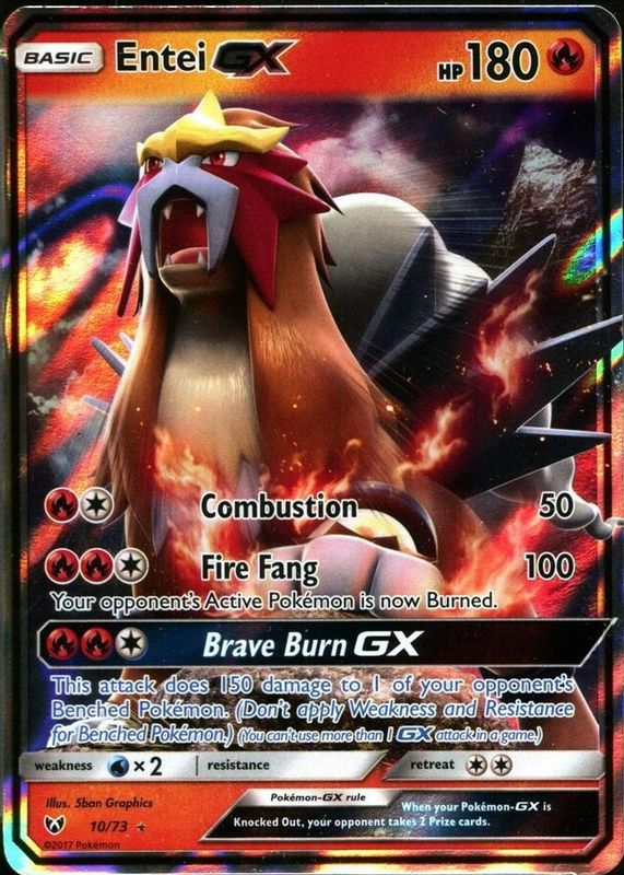 Entei GX's Pokemon cards are available in at least 1 sets. Entei GX's biggest 7-day price movers are 2017 Sun & Moon: Shining Legends #10/73 Holo, 2017 Sun & Moon: Shining Legends #71/73 Holo (Full Art), and 2017 Sun & Moon: Shining Legends #10a/73 Holo (Alternate Art Promo).