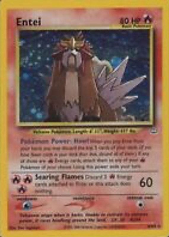Entei's Pokemon cards are available in at least 17 sets. Entei's biggest 7-day price movers are 2001 Pokemon Game Movie #34 Reverse Holo (Movie Promo), 2001 Neo Revelation #6/64 Holo, and 2002 Japanese Wind from the Sea #27/87 1st Edition Holo.
