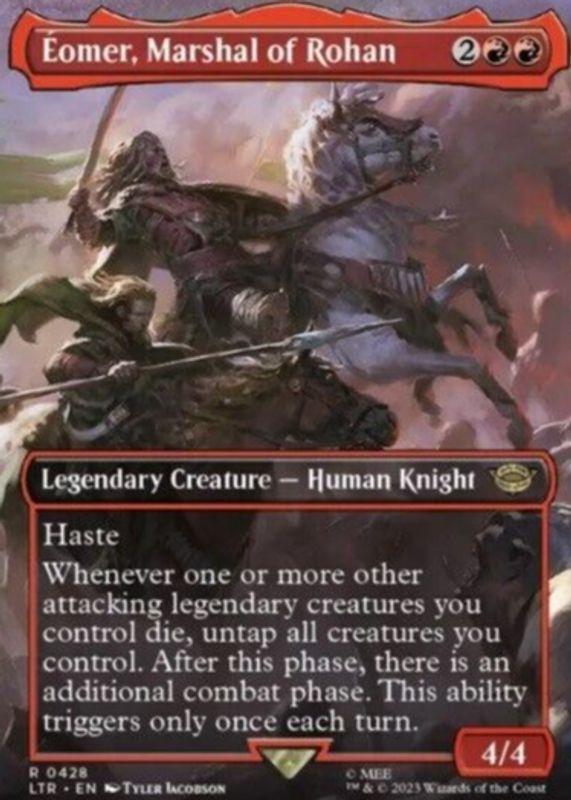 The biggest 30-day change Eomer, Marshal of Rohan cards are 2023 The Lord of the Rings: Tales of Middle-Earth #428 Foil Borderless, and 2023 The Lord of the Rings: Tales of Middle-Earth #120 Foil.