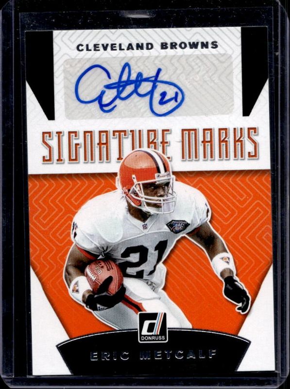 Eric Metcalf's Football cards are available in at least 75 sets. Eric Metcalf's biggest 7-day price movers are 2019 Donruss #SM-36 Signatures Marks, 2019 Donruss #SM-36 Signatures Marks - Green /25, and 2019 Donruss #SM-36 Signatures Marks - Blue /50.