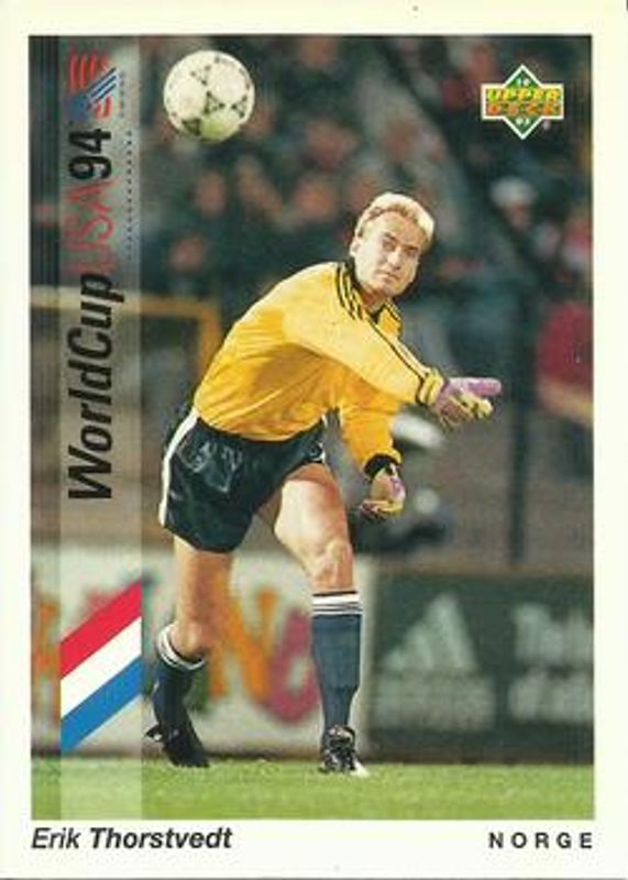 Erik Thorstvedt's Soccer cards are available in at least 6 sets. Erik Thorstvedt's biggest 7-day price movers are 1993 Upper Deck World Cup Preview (English/Spanish) #87 Base, 1993 Upper Deck World Cup Preview (English/German) #40 Base, and 1993 Upper Deck World Cup Preview Adams Gum #99 Base.