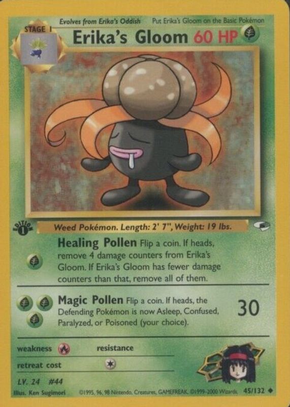 Erika's Gloom's Pokemon cards are available in at least 1 sets. Erika's Gloom's biggest 7-day price movers are 2000 Gym Heroes #045/132 1st Edition, and 2000 Gym Heroes #046/132 1st Edition.