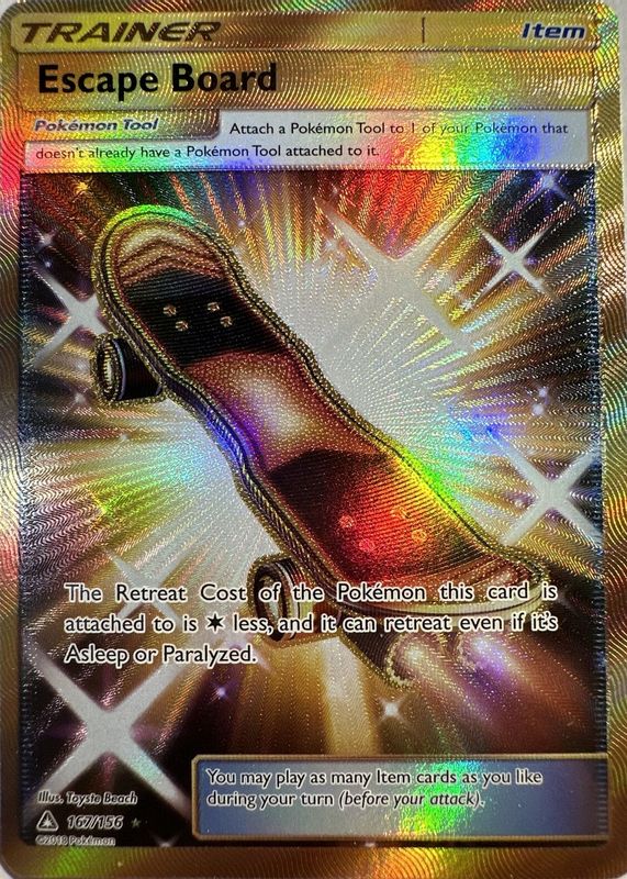Escape Board's Pokemon cards are available in at least 4 sets. Escape Board's biggest 7-day price movers are 2018 Sun & Moon: Ultra Prism #167/156 Holo (Secret), 2017 Japanese Sun & Moon: Ultra Moon #077/066 Ultra Rare, and 2019 Japanese Sun & Moon: Remix Bout #062/064 Trainer Rare.