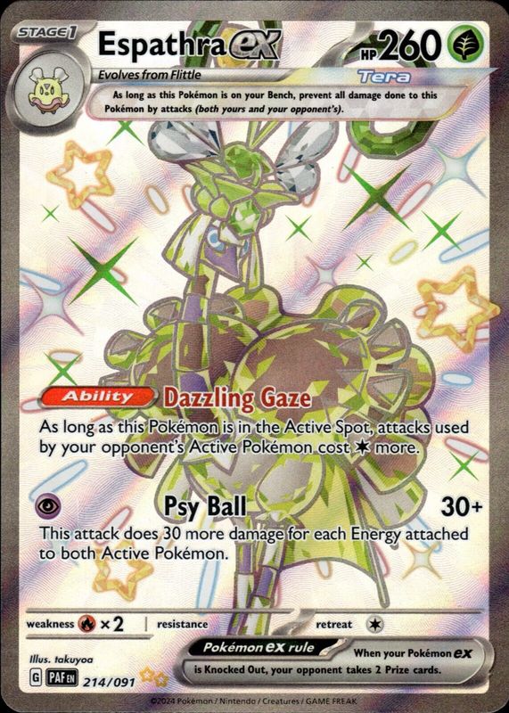 Espathra ex's Pokemon cards are available in at least 2 sets. Espathra ex's biggest 7-day price movers are 2023 Japanese Scarlet & Violet: Shiny Treasure ex #323/190 Shiny Super-Rare, 2024 Scarlet & Violet: Paldean Fates #214/091 Shiny Ultra Rare, and 2024 Scarlet & Violet: Paldean Fates #006/091 Double Rare.