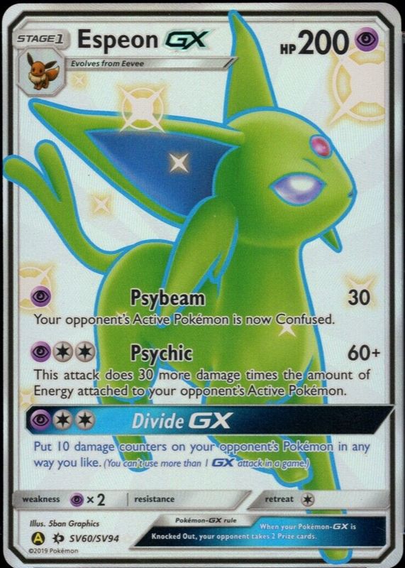 Espeon GX's Pokemon cards are available in at least 3 sets. Espeon GX's biggest 7-day price movers are 2019 Sun & Moon: Hidden Fates #SV60/SV94 Shiny Rare (Full Art), 2017 Sun & Moon #152/149 Holo (Secret), and 2017 Sun & Moon #140/149 Holo (Full Art).