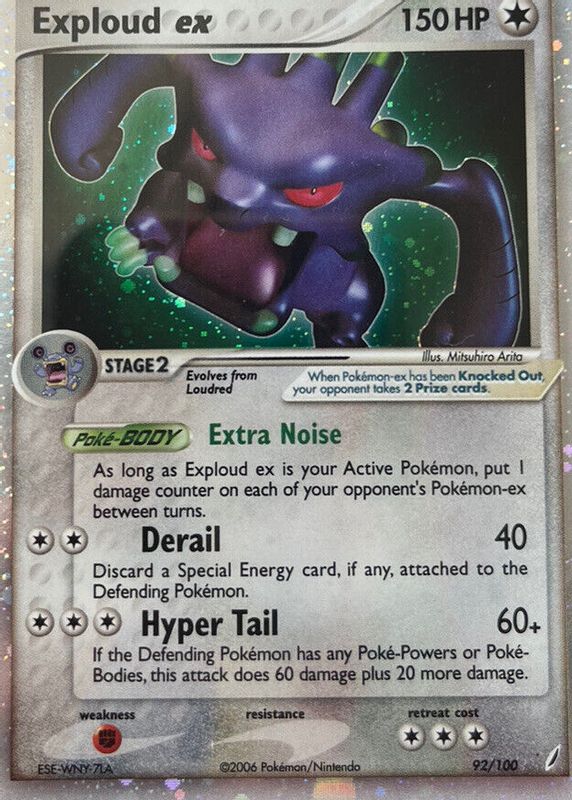 Exploud ex's Pokemon cards are available in at least 2 sets. Exploud ex's biggest 7-day price movers are 2006 EX: Crystal Guardians #092/100 Holo, and 2006 Japanese EX: Miracle Crystal #057/075 1st Edition Holo.