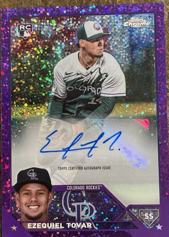 Ezequiel Tovar's Baseball cards are available in at least 42 sets. Ezequiel Tovar's biggest 7-day price movers are 2023 Topps Chrome #RA-ET Rookie Autographs - Purple Speckle Refractor /299, 2023 Topps Chrome Update #AC-ET Autographs - Purple Speckle Refractor /299, and 2023 Topps Chrome Update #AC-ET Autographs - Aqua Wave Refractor /199.