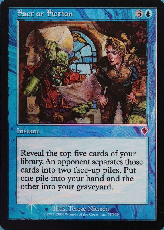 Fact or Fiction's Magic: The Gathering cards are available in at least 1 sets. Fact or Fiction's biggest 7-day price movers are 2000 Invasion #57 Foil, and 2000 Invasion #57 Base.