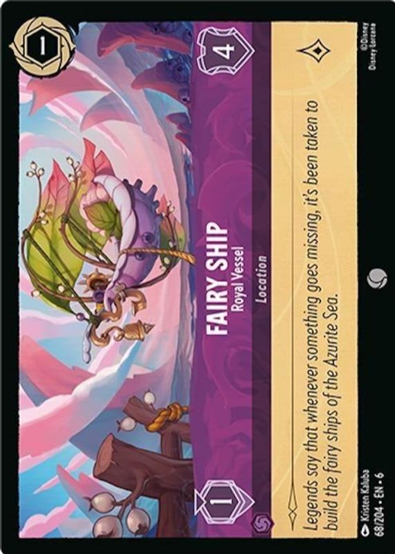 Fairy Ship's Disney Lorcana cards are available in at least 1 sets. Fairy Ship's biggest 7-day price movers are 2024 Azurite Sea #68/204 Cold Foil, and 2024 Azurite Sea #68/204 Base.