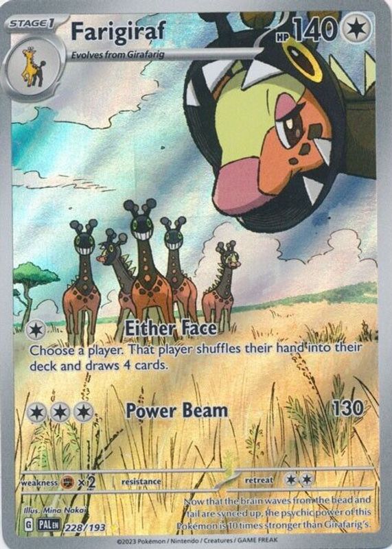 Farigiraf's Pokemon cards are available in at least 1 sets. Farigiraf's biggest 7-day price movers are 2023 Scarlet & Violet: Paldea Evolved #155/193 Base, 2023 Scarlet & Violet: Paldea Evolved #155/193 Reverse Holo, and 2023 Scarlet & Violet: Paldea Evolved #228/193 Illustration Rare.