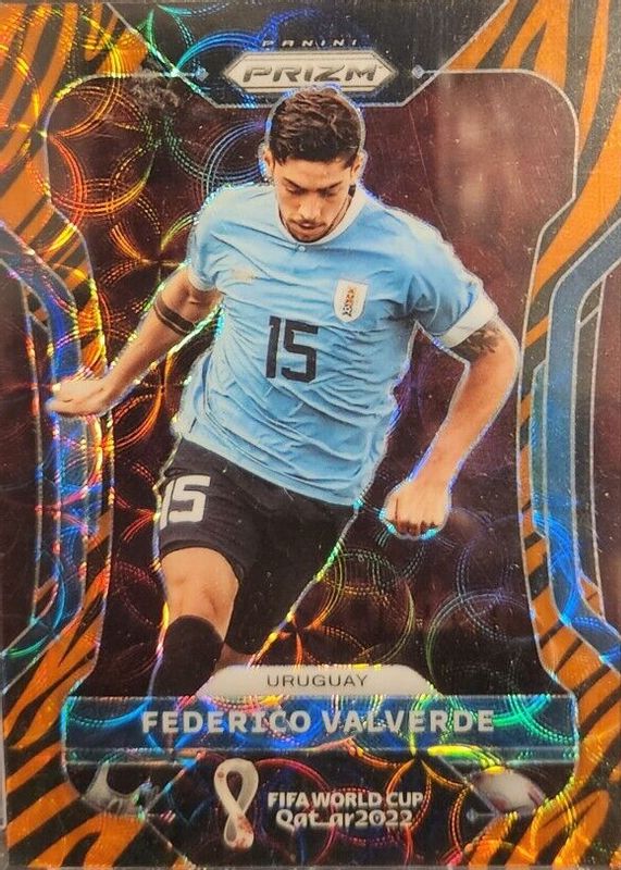 Federico Valverde's Soccer cards are available in at least 106 sets. Federico Valverde's biggest 7-day price movers are 2020 Topps Chrome UEFA Champions League #JB-11 Joga Bonito, 2022 Prizm World Cup #277 Choice Tiger Stripe /(SSP), and 2024 Prizm Copa America #II-FVE International Ink.