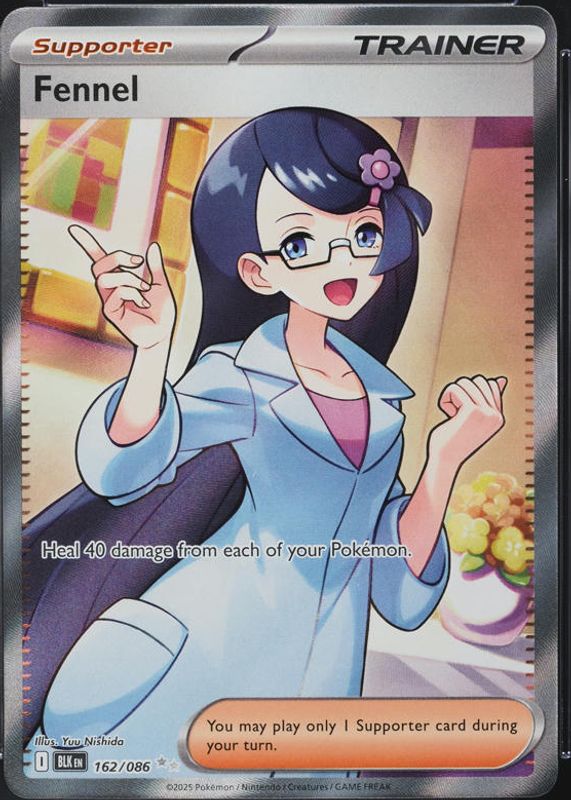 Fennel's Pokemon cards are available in at least 2 sets. Fennel's biggest 7-day price movers are 2025 Japanese Scarlet & Violet: Black Bolt #166/086 Super Rare (Full Art), 2025 Japanese Scarlet & Violet: Black Bolt #085/086 Base, and 2025 Japanese Scarlet & Violet: Black Bolt #085/086 Master Ball Reverse Holo.