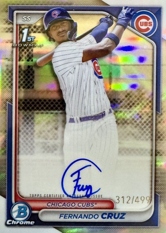 Fernando Cruz (Cubs)'s Baseball cards are available in at least 3 sets. Fernando Cruz (Cubs)'s biggest 7-day price movers are 2024 Bowman Chrome Mega Box #BCP-197 Prospects (1st), 2024 Bowman Chrome #CPA-FC Prospect Auto - Refractor /499 (1st), and 2024 Bowman Chrome Sapphire Edition #CSPA-FC Prospect Auto - Green /99 (1st).