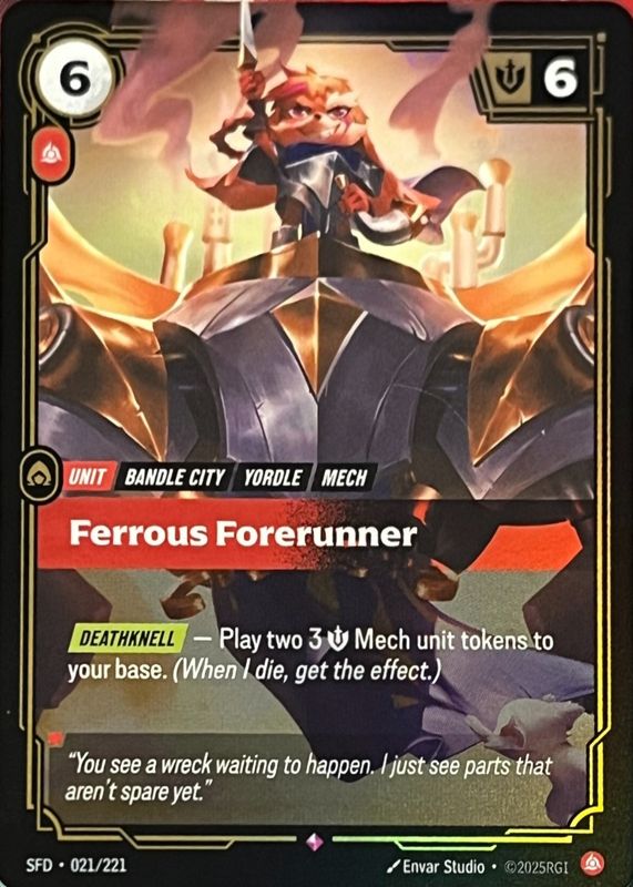 Ferrous Forerunner's Riftbound cards are available in at least 1 sets. Ferrous Forerunner's biggest 7-day price movers are 2026 Spiritforged #021/221 Foil.