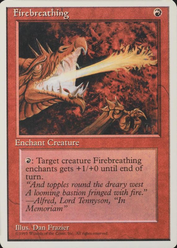 Firebreathing's Magic: The Gathering cards are available in at least 5 sets. Firebreathing's biggest 7-day price movers are 1995 Fourth Edition Base, 1993 Alpha Edition Base, and 1996 Alliances Base.