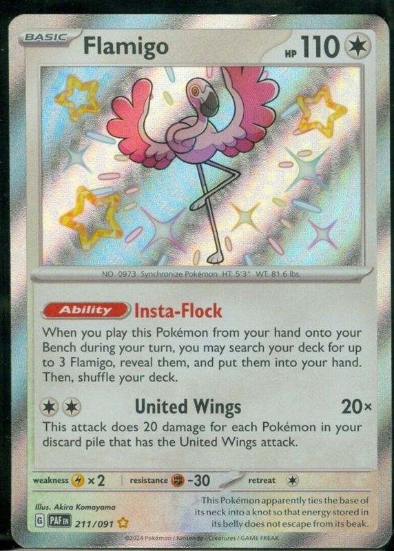 Flamigo's Pokemon cards are available in at least 4 sets. Flamigo's biggest 7-day price movers are 2023 Scarlet & Violet: Paldea Evolved #227/193 Illustration Rare, 2024 Scarlet & Violet: Paldean Fates #211/091 Shiny Rare, and 2023 Scarlet & Violet: Paldea Evolved #170/193 Base.