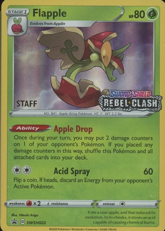 Flapple's Pokemon cards are available in at least 6 sets. Flapple's biggest 7-day price movers are 2021 Sword & Shield: Shining Fates #SV013 Shiny Rare, 2024 Scarlet & Violet: Surging Sparks #139/191 Reverse Holo, and 2020 Sword & Shield: Black Star Promo #SWSH022 Build & Battle Box (Rebel Clash) (Staff).