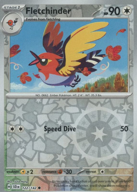 Fletchinder's Pokemon cards are available in at least 12 sets. Fletchinder's biggest 7-day price movers are 2024 Scarlet & Violet: Stellar Crown #122/142 Reverse Holo, 2024 Japanese Scarlet & Violet: Stellar Miracle #084/102 Base, and 2023 Scarlet & Violet: Paldea Evolved #029/193 Reverse Holo.
