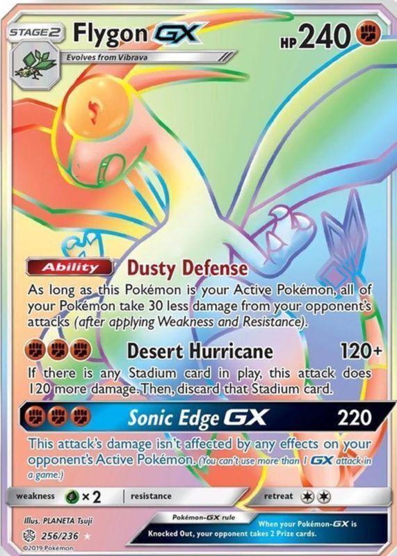 Flygon GX's Pokemon cards are available in at least 2 sets. Flygon GX's biggest 7-day price movers are 2019 Sun & Moon: Cosmic Eclipse #256/236 Holo (Secret), 2019 Sun & Moon: Cosmic Eclipse #218/236 Holo (Full Art), and 2019 Japanese Sun & Moon: Alter Genesis #111/095 Hyper Rare.