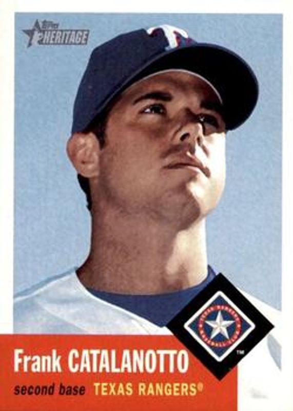 Frank Catalanotto's Baseball cards are available in at least 17 sets. Frank Catalanotto's biggest 7-day price movers are 2002 Topps Heritage #188 Base, 2004 Topps Heritage #52 Base, and 2006 Topps Heritage #17 Base.