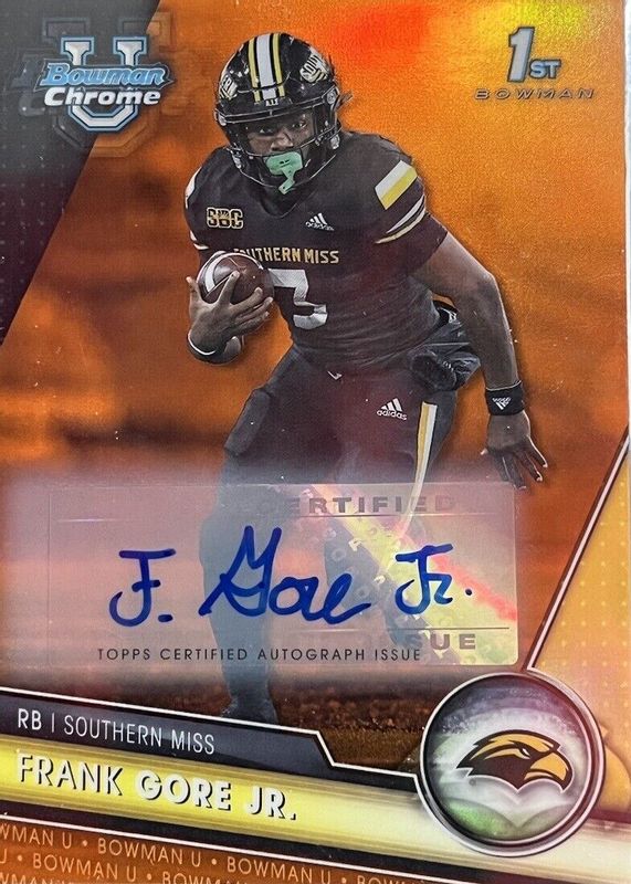 Frank Gore Jr.'s Football cards are available in at least 3 sets. Frank Gore Jr.'s biggest 7-day price movers are 2023 Bowman Chrome University #137 Prospect Auto - Orange Refractor /25 (1st), 2023 Bowman Chrome University #137 Prospect Auto (1st), and 2023 Bowman Chrome University #137 Prospect Auto - Yellow Refractor /75 (1st).