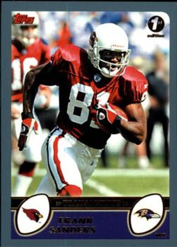 Frank Sanders' Football cards are available in at least 69 sets. Frank Sanders' biggest 7-day price movers are 2003 Topps 1st Edition #62 Base, 2003 Topps #62 Black /150, and 2003 Topps #62 Gold /499.