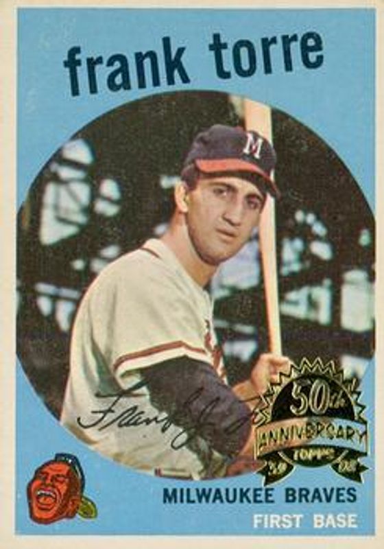 Frank Torre's Baseball cards are available in at least 12 sets. Frank Torre's biggest 7-day price movers are 2008 Topps Heritage #65 50th Anniversary Buybacks, 2009 Topps Heritage #478 50th Anniversary Buybacks, and 2011 Topps Heritage #303 50th Anniversary Buybacks.