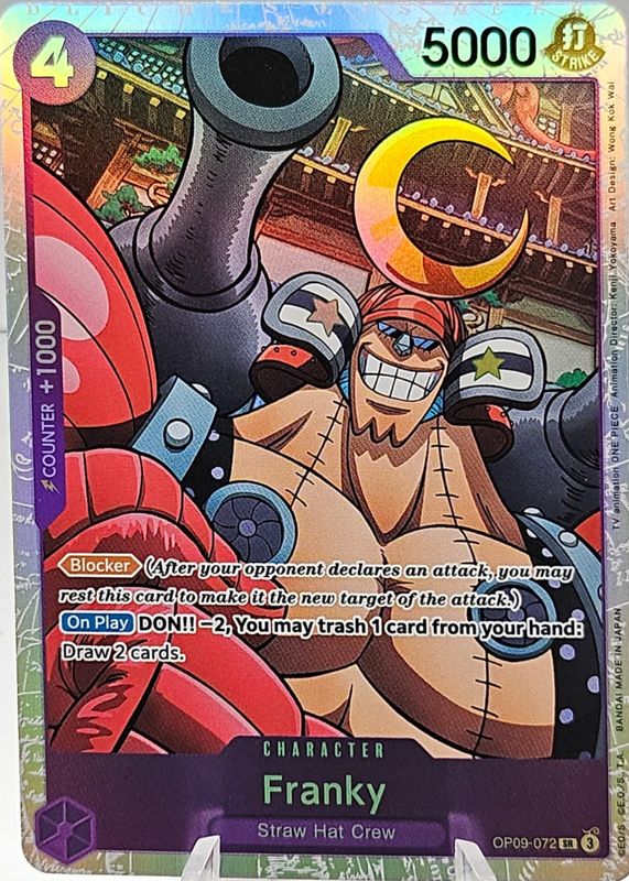 Franky's One Piece cards are available in at least 6 sets. Franky's biggest 7-day price movers are 2024 Emperors in the New World #OP09-072 Super Rare (Alternate Art), 2024 Emperors in the New World #OP09-072 Super Rare, and 2024 500 Years in the Future #OP07-107 Foil (Alternate Art).