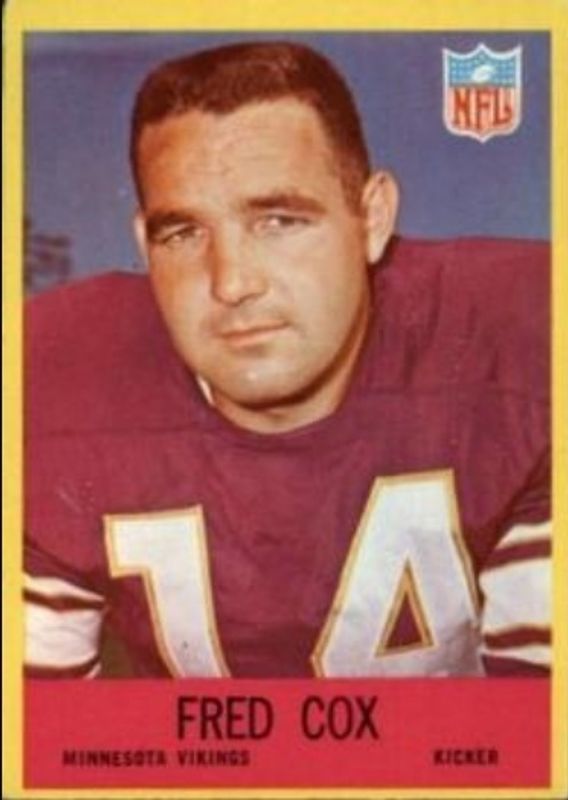 Fred Cox's Football cards are available in at least 12 sets. Fred Cox's biggest 7-day price movers are 1967 Philadelphia #100 Base, 1968 Topps #107 Base, and 1969 Topps #217 Base.