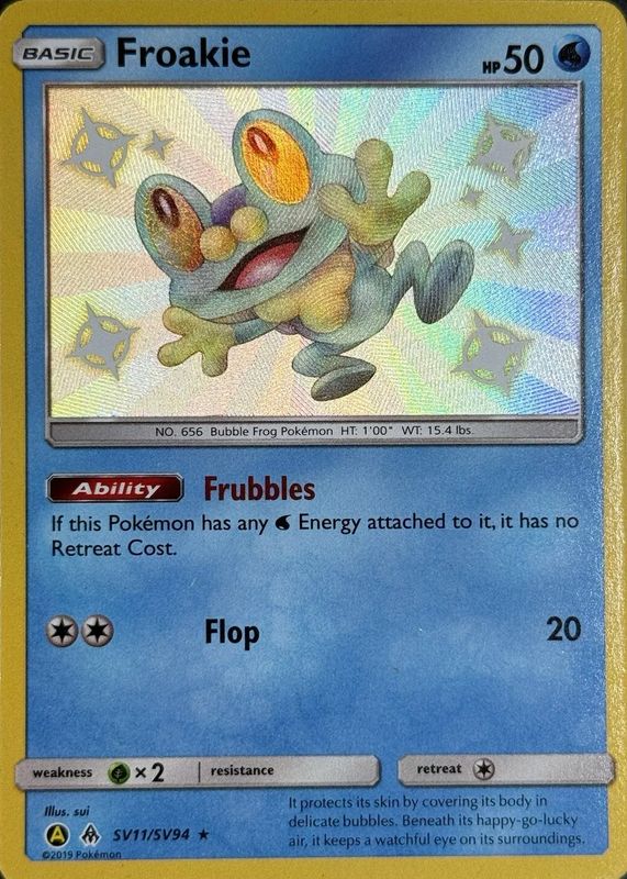 Froakie's Pokemon cards are available in at least 8 sets. Froakie's biggest 7-day price movers are 2019 Sun & Moon: Hidden Fates #SV11/SV94 Shiny Rare, 2024 Scarlet & Violet: Stellar Crown #039/142 Reverse Holo, and 2015 Japanese XY: Rage of the Broken Heavens #027/080 1st Edition.