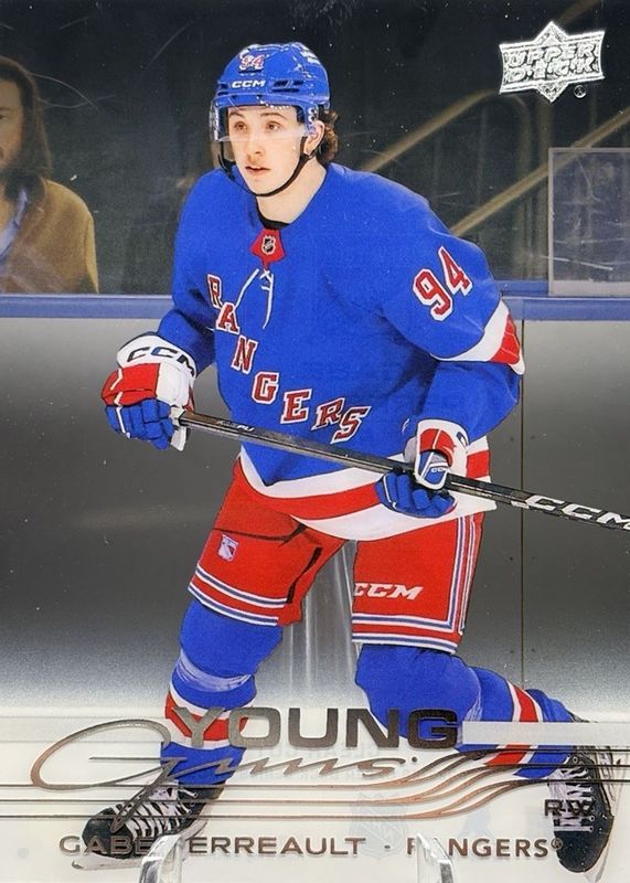 Gabe Perreault's Hockey cards are available in at least 3 sets. Gabe Perreault's biggest 7-day price movers are 2025 Upper Deck #202 Young Guns - Clear Cut, 2025 Upper Deck MVP #CC-50 Colors & Contours /250, and 2025 Upper Deck MVP #250 Super Script /25.