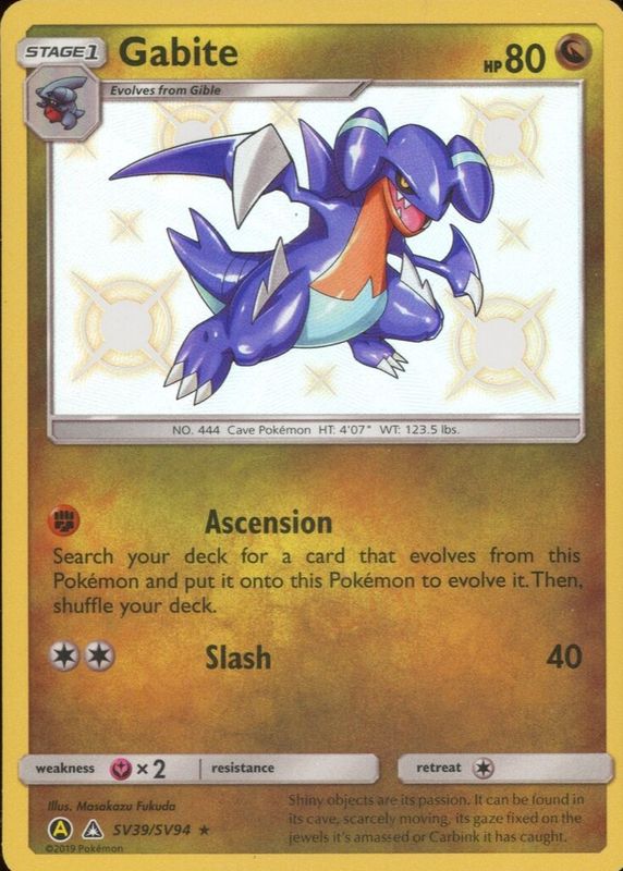 Gabite's Pokemon cards are available in at least 14 sets. Gabite's biggest 7-day price movers are 2019 Sun & Moon: Hidden Fates #SV39/SV94 Shiny Rare, 2009 Japanese Platinum: Beat of the Frontier #084/100 1st Edition, and 2007 Diamond & Pearl: Mysterious Treasures #048/123 Promo (Prerelease).