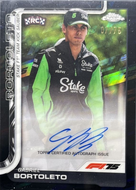 Gabriel Bortoleto's Racing cards are available in at least 6 sets. Gabriel Bortoleto's biggest 7-day price movers are 2025 Topps Chrome Formula 1 #20 Refractor, 2025 Topps Chrome Formula 1 #CAC-BOR Chrome Autographs - 75th Anniversary Refractor /75, and 2025 Topps Chrome Formula 1 #20 Base.