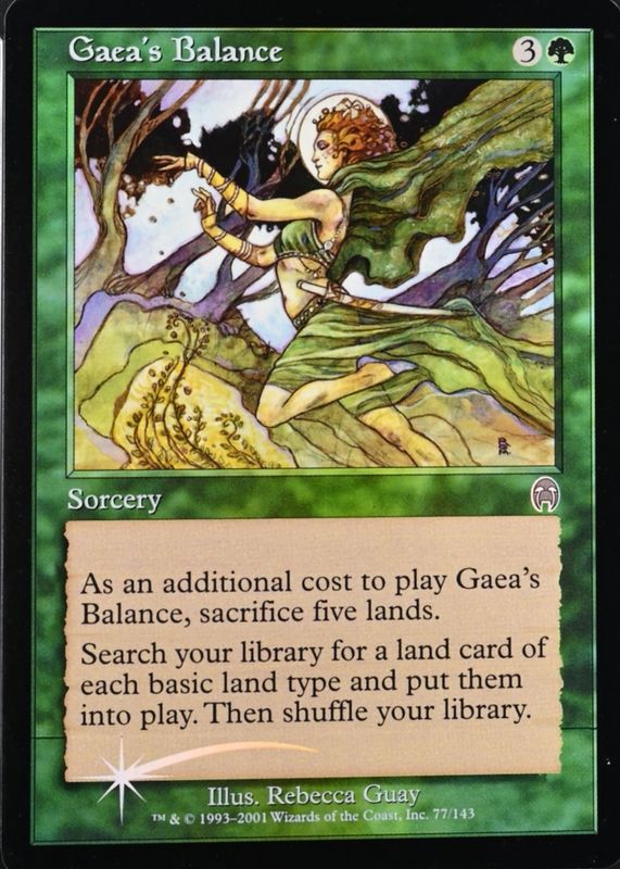 Gaea's Balance's Magic: The Gathering cards are available in at least 1 sets. Gaea's Balance's biggest 7-day price movers are 2001 Apocalypse #77 Foil, and 2001 Apocalypse #77 Base.