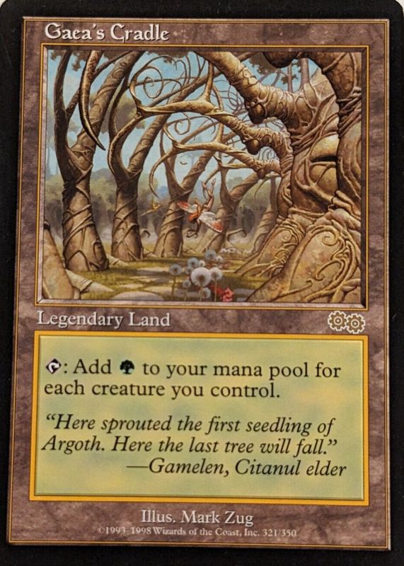 Gaea's Cradle's Magic: The Gathering cards are available in at least 1 sets. Gaea's Cradle's biggest 7-day price movers are 1998 Urza's Saga #321 Base, and 1998 Urza's Saga #321/350 Base.