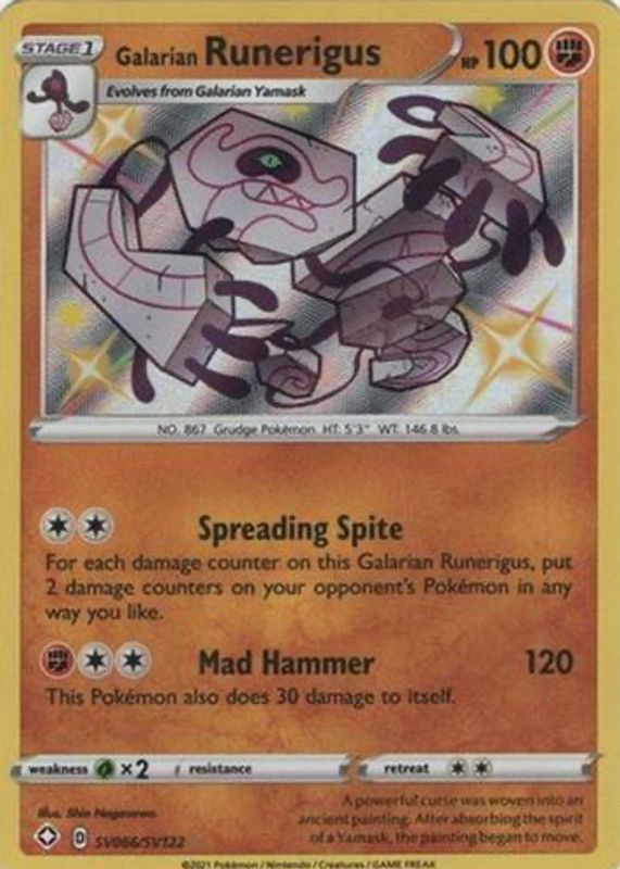 Galarian Runerigus' Pokemon cards are available in at least 2 sets. Galarian Runerigus' biggest 7-day price movers are 2021 Sword & Shield: Shining Fates #SV066 Shiny Rare, and 2021 Japanese Sword & Shield: Peerless Fighters #42/70 Holo.