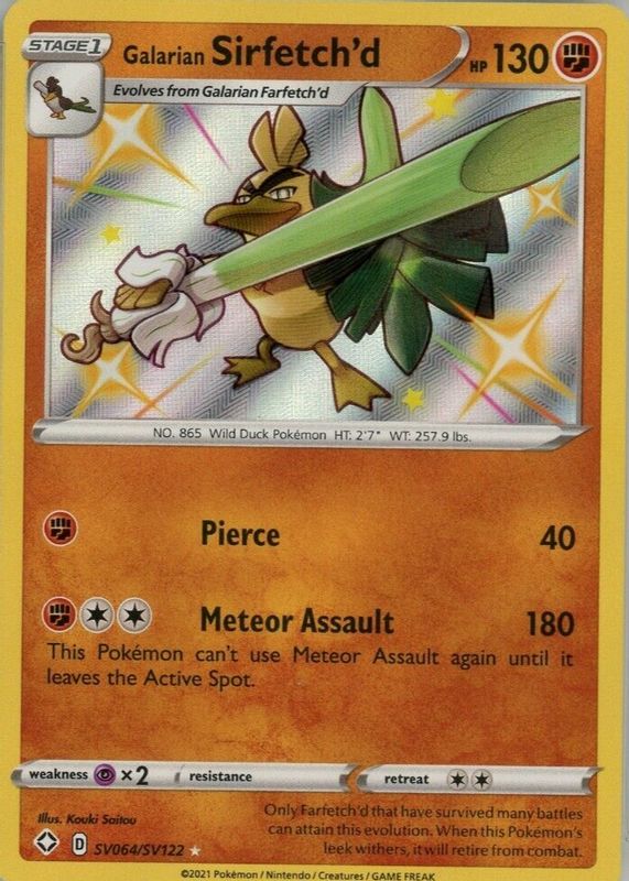 Galarian Sirfetch'd's Pokemon cards are available in at least 2 sets. Galarian Sirfetch'd's biggest 7-day price movers are 2021 Japanese Sword & Shield: Peerless Fighters #36/70 Base, and 2021 Sword & Shield: Shining Fates #SV064 Shiny Rare.