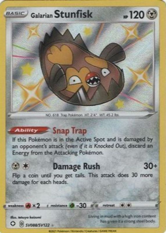 Galarian Stunfisk's Pokemon cards are available in at least 2 sets. Galarian Stunfisk's biggest 7-day price movers are 2021 Sword & Shield: Shining Fates #SV088 Shiny Rare, 2025 Scarlet & Violet: Journey Together #106/159 Base, and 2025 Scarlet & Violet: Journey Together #106/159 Reverse Holo.