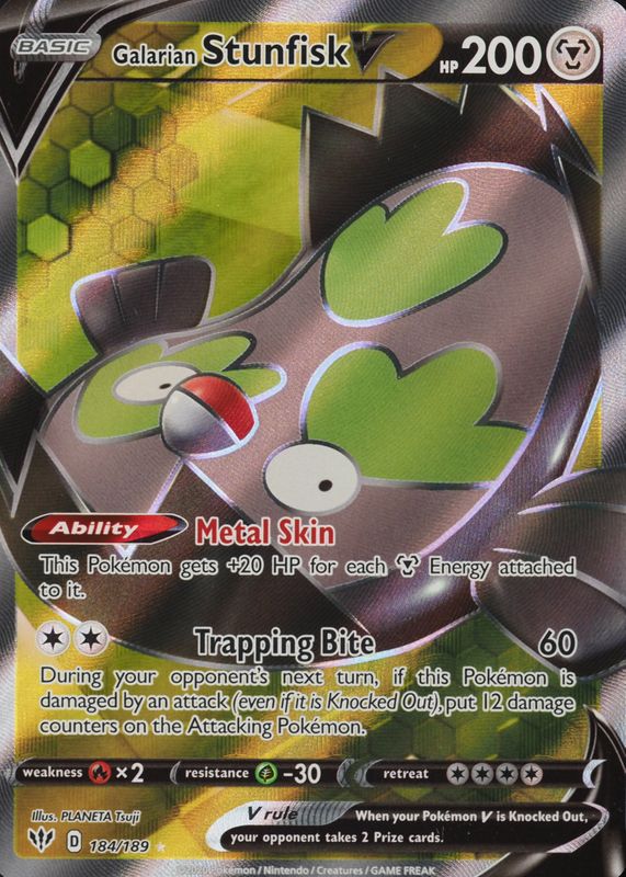 Galarian Stunfisk V's Pokemon cards are available in at least 2 sets. Galarian Stunfisk V's biggest 7-day price movers are 2020 Sword & Shield: Darkness Ablaze #184/189 Holo (Full Art), 2020 Japanese Sword & Shield: Explosive Walker #055/070 Double Rare, and 2020 Japanese Sword & Shield: Explosive Walker #076/070 Super Rare (Full Art).