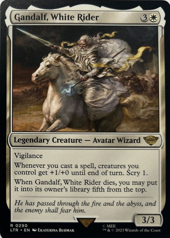 Gandalf, White Rider's Magic: The Gathering cards are available in at least 1 sets. Gandalf, White Rider's biggest 7-day price movers are 2023 The Lord of the Rings: Tales of Middle-Earth #290 Base, and 2023 The Lord of the Rings: Tales of Middle-Earth #389 Base Extended Art.