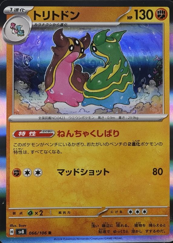 Gastrodon's Pokemon cards are available in at least 5 sets. Gastrodon's biggest 7-day price movers are 2024 Scarlet & Violet: Surging Sparks #107/191 Holo, 2024 Scarlet & Violet: Surging Sparks #107/191 Reverse Holo, and 2024 Japanese Scarlet & Violet: Super Electric Breaker #066/106 Holo.