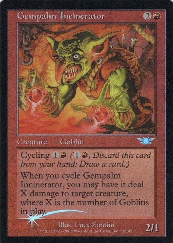 Gempalm Incinerator's Magic: The Gathering cards are available in at least 1 sets. Gempalm Incinerator's biggest 7-day price movers are 2003 Legions #94 Foil, and 2003 Legions #94 Base.