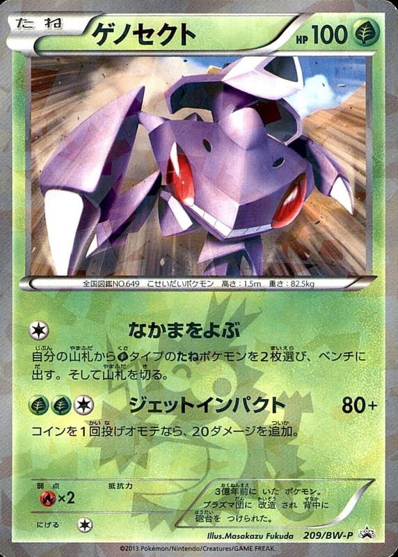 Genesect's Pokemon cards are available in at least 7 sets. Genesect's biggest 7-day price movers are 2013 Japanese BW-P Promo #209/BW-P April CoroCoro Magazine, 2013 Japanese BW-P Promo #231/BW-P EX Battle Boost Campaign, and 2013 Japanese BW-P Promo #219/BW-P Original Card Campaign.