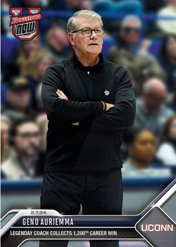 Geno Auriemma's Basketball cards are available in at least 3 sets. Geno Auriemma's biggest 7-day price movers are 2023 Bowman U Now #46 Base (Print Run: 390), 2023 Bowman U Now #46 Blue /49, and 2023 Bowman U Now #46 Purple /25.