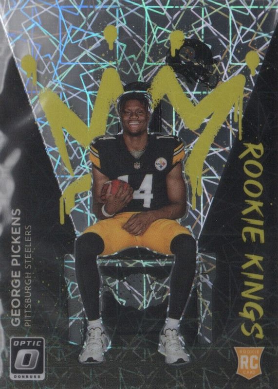 George Pickens' Football cards are available in at least 51 sets. George Pickens' biggest 7-day price movers are 2022 Mosaic #318 Base, 2022 Prizm #329 Silver, and 2022 Optic #223 Pink.