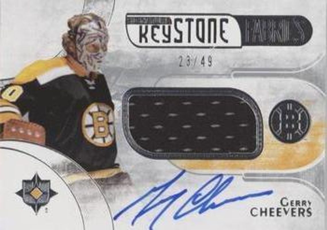 Gerry Cheevers' Hockey cards are available in at least 125 sets. Gerry Cheevers' biggest 7-day price movers are 2016 Upper Deck Ultimate Collection #SKF-GC Keystone Fabrics Autographs /49, 2020 Upper Deck Clear Cut #HFS-GC Hall of Fame Showcase /35, and 2020 Upper Deck Clear Cut #HFS-GC Hall of Fame Showcase - Gold /1.
