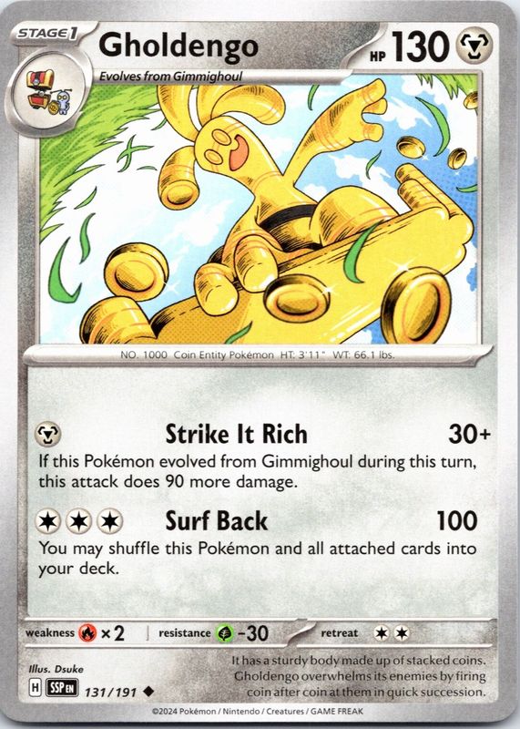 Gholdengo's Pokemon cards are available in at least 5 sets. Gholdengo's biggest 7-day price movers are 2024 Scarlet & Violet: Surging Sparks #131/191 Base, 2024 Scarlet & Violet: Surging Sparks #131/191 Reverse Holo, and 2024 Japanese Scarlet & Violet: Paradise Dragona #038/064 Base.