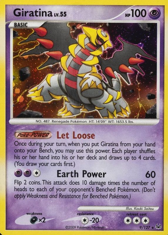 Giratina's Pokemon cards are available in at least 8 sets. Giratina's biggest 7-day price movers are 2009 Platinum #009/127 Holo, 2008 Japanese Diamond & Pearl: Intense Fight in the Destroyed Sky #048/092 1st Edition Holo, and 2009 Platinum #010/127 Holo.