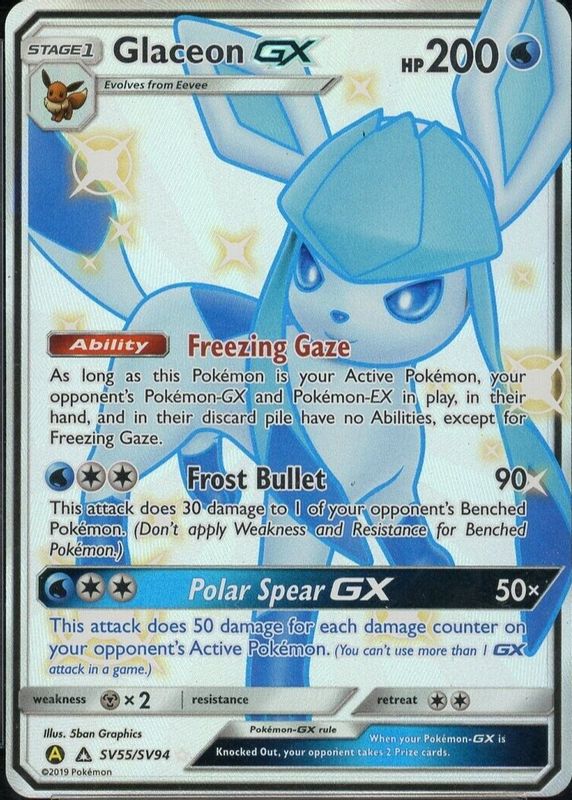 Glaceon GX's Pokemon cards are available in at least 5 sets. Glaceon GX's biggest 7-day price movers are 2018 Sun & Moon: Black Star Promo #SM147 Evolution Celebration Tins, 2019 Sun & Moon: Hidden Fates #SV55/SV94 Shiny Rare (Full Art), and 2018 Sun & Moon: Ultra Prism #159/156 Holo (Secret).